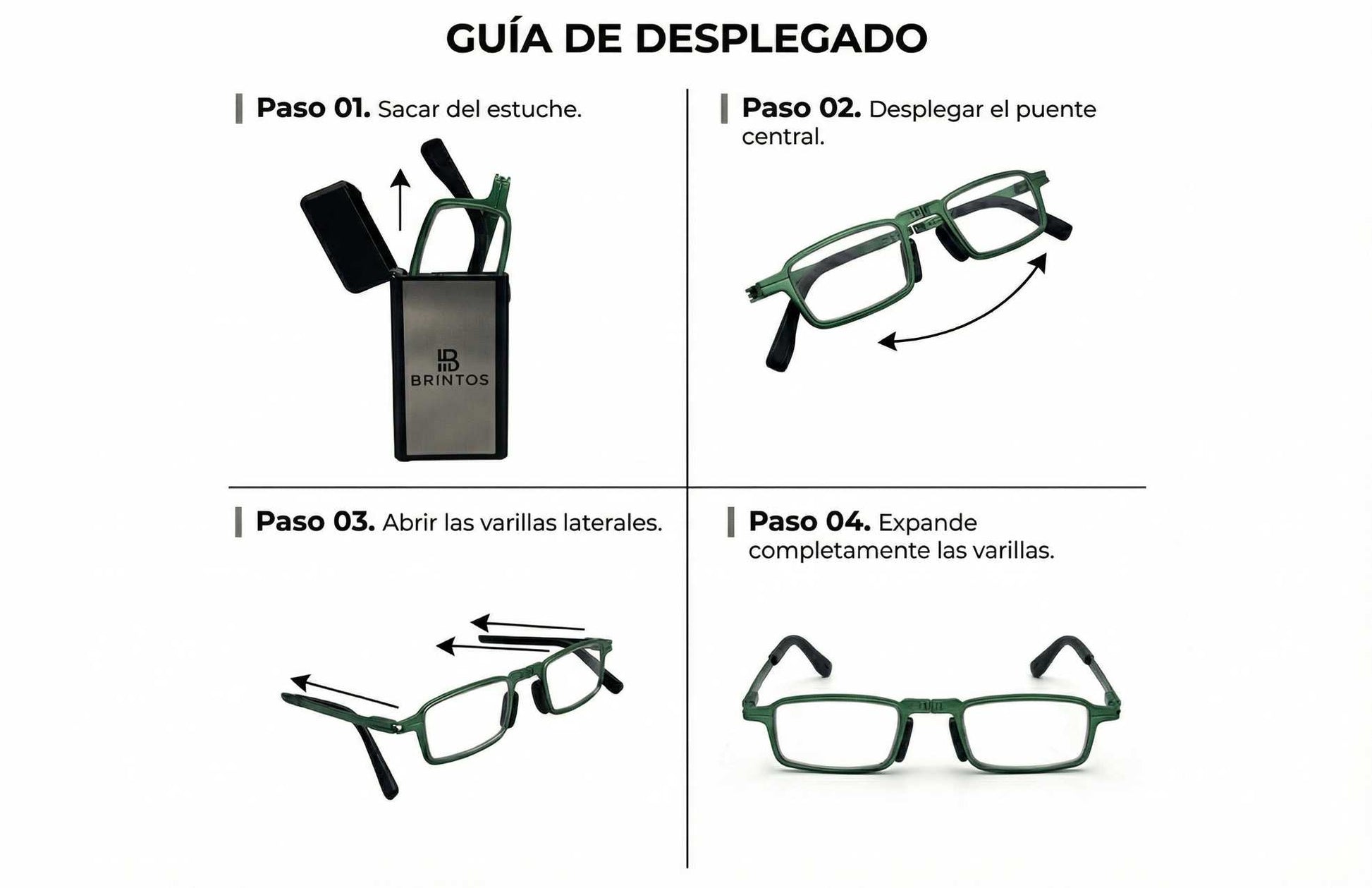 Están diseñadas para durar años. A diferencia de las gafas de plástico convencionales, el chasis de acero inoxidable de Brintos ha sido sometido a rigurosos tests de fatiga mecánica, superando los 5.000 ciclos de apertura y cierre.